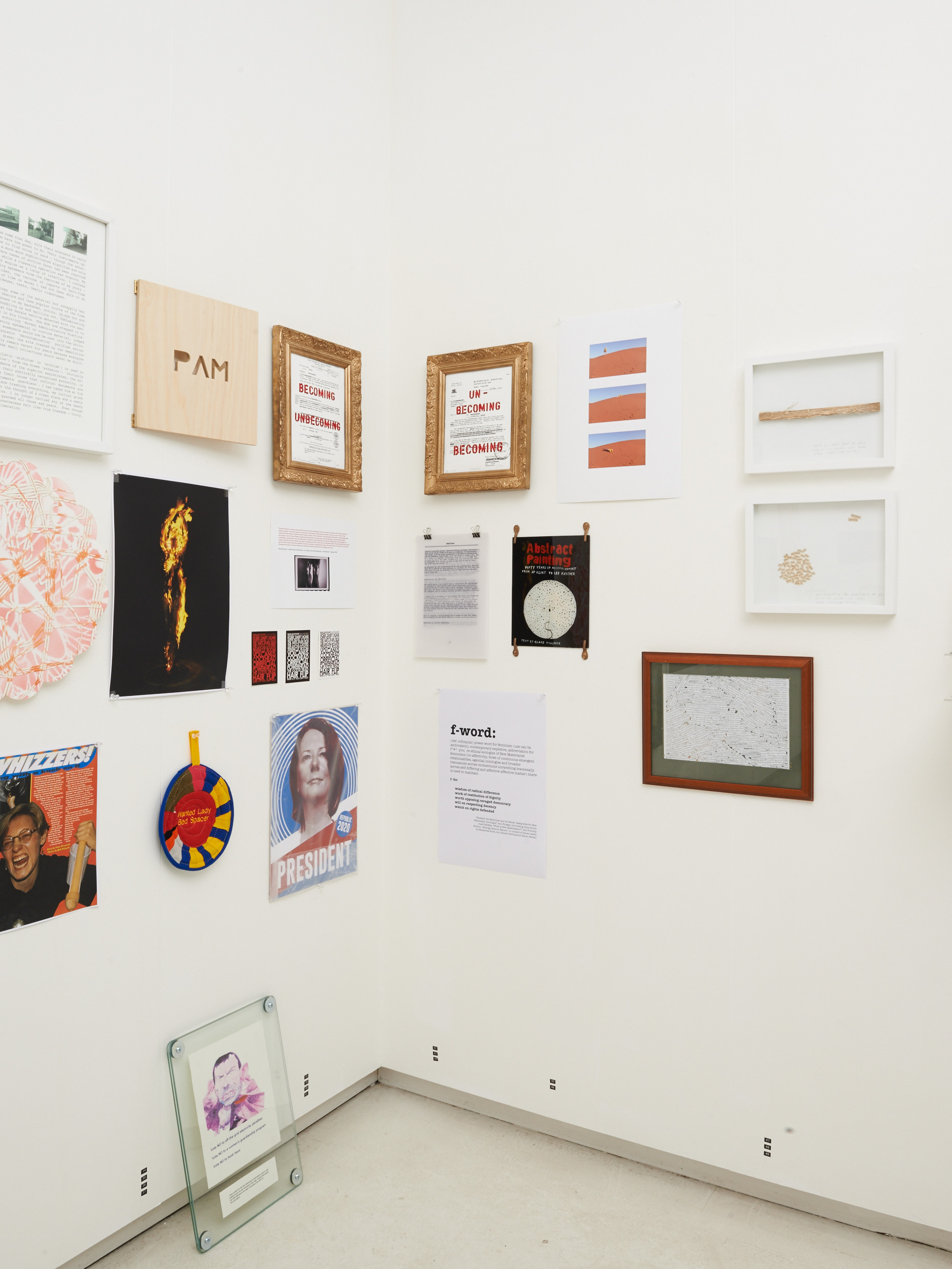 The exhibition ‘Notes to a Future Feminist Archive’ was arranged to coincide with Contemporary Art and Feminism’s (CAF) March launch of ‘Future Feminist Archives’, a program of events that included a conference at the Art Gallery of NSW, an exhibition at Sydney College of the Arts and a national calendar of associated exhibitions at regional galleries, university galleries and artist run spaces. CAF also partnered with Design and Art Australia Online (DAAO) to undertake archiving workshops in selected regional centres to boost women’s representation in both online and material archives. March 2015 was the 40th anniversary of International Women’s Day and the 20th anniversary of the National Women’s Art Exhibition which was held across 150 or so galleries and institutions around Australia.