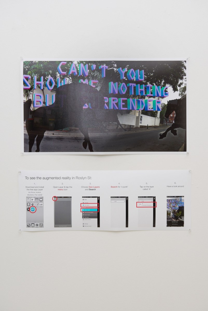 Linda Dement, ‘Patti Smith is god and she asks you this’, 2015, geolocated augmented reality, print 59.4 x 35 cm and instructions 59.4 x 21 cm. (see instructions on roomsheet) Photo credit: Felicity Jenkins