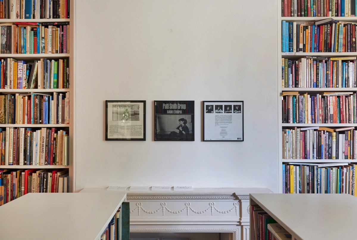 liner notes for Patti Smith Group Radio Ethiopia, cover of Radio Ethiopia and back cover of Horses by Patti Smith. Also on the mantelpiece are take-home copies of Catherine Clover’s postcard series ‘Make ravens of us all’. Photo credit: Felicity Jenkins